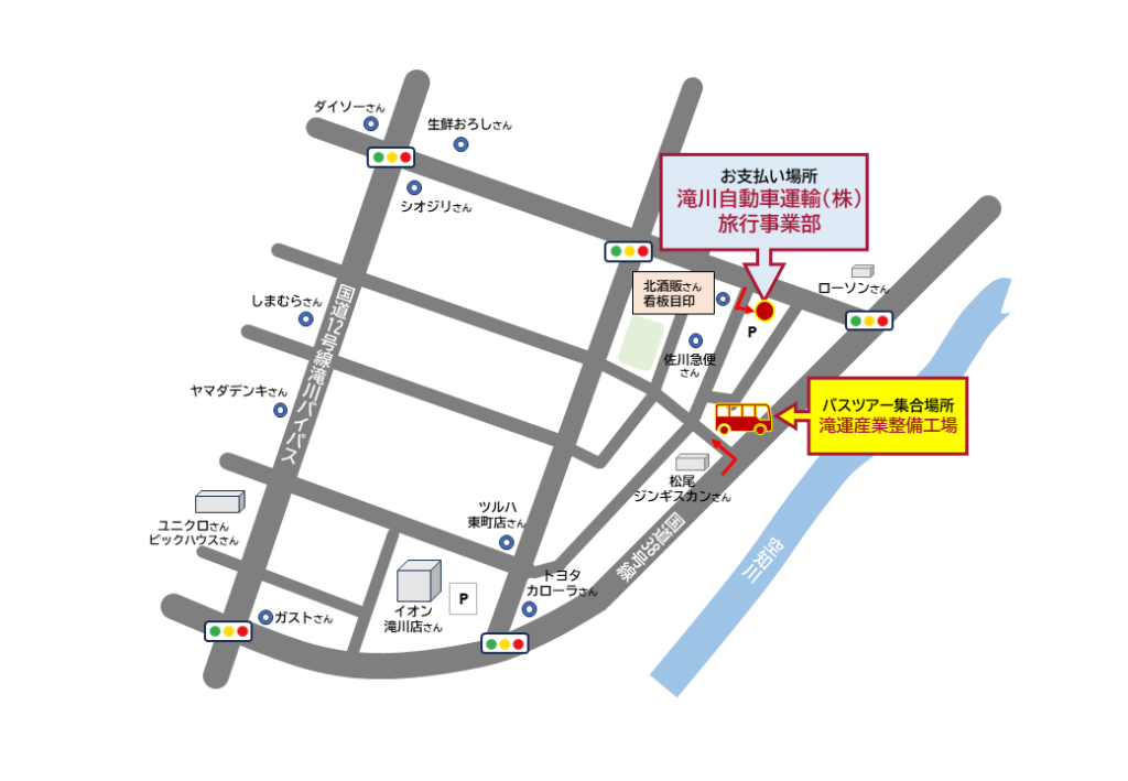 滝川自動車運輸株式会社旅行事業部〒073-0025 滝川市流通団地2丁目3番13号TEL:0125-22-1122 フリーダイヤル:0120-973-582当社(お支払い場所)とバスツアー集合場所は300mほど離れておりますのでご注意下さいますようお願い致します。バスツアー集合場所は国道38号、松尾ジンギスカンの看板を目印にして頂けると分かりやすいと思います。
