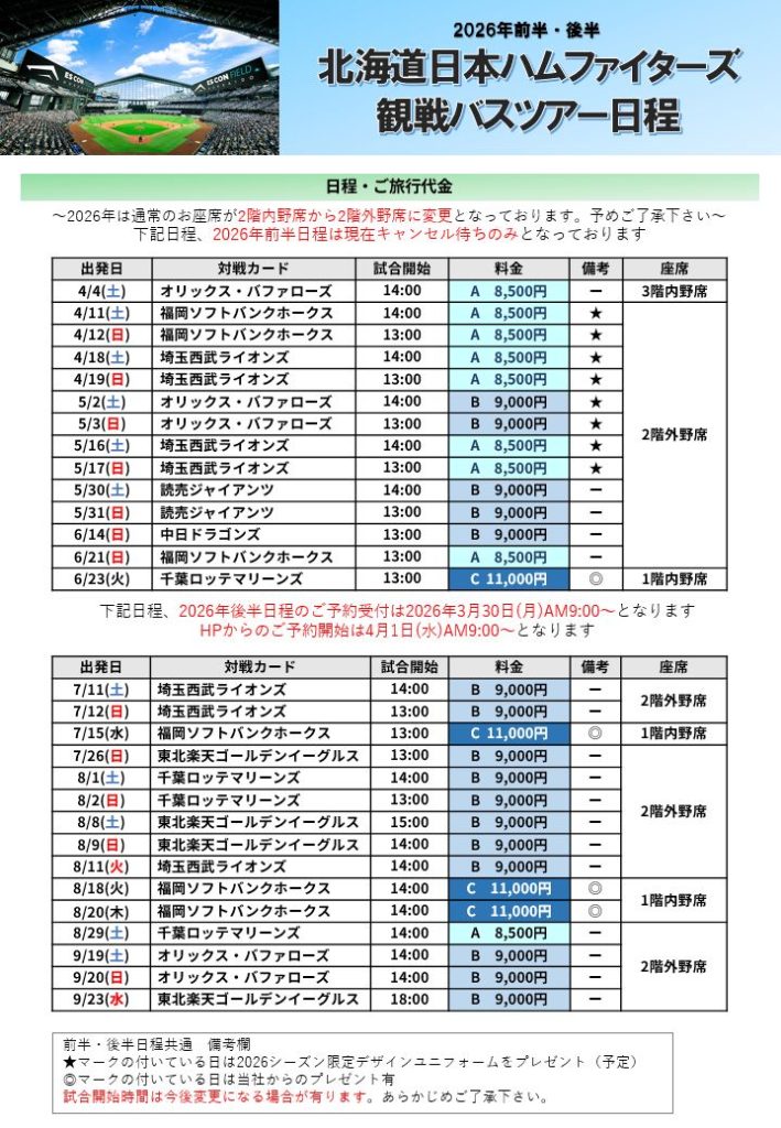 2月2日(月)より受付を開始させて頂きました「北海道日本ハムファイターズ観戦バスツアー」につきまして初日より大変多くのお申し込みをいただき、全日程全て完売となっております。