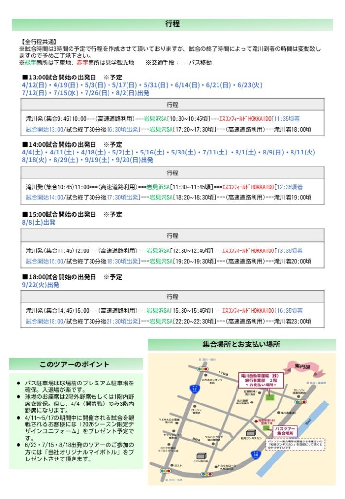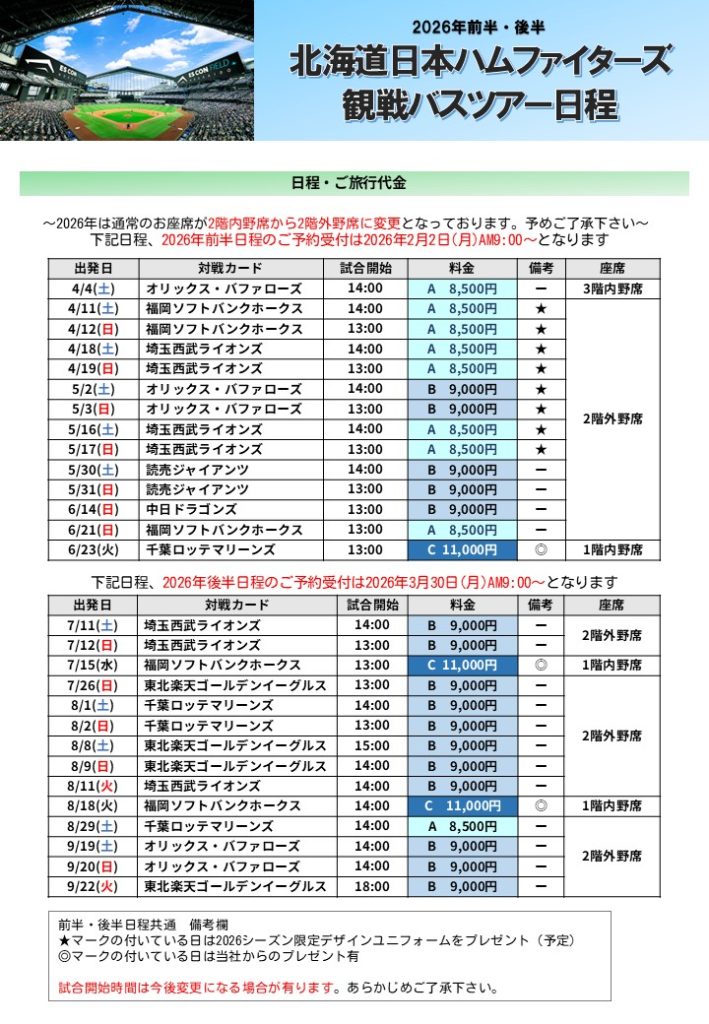2月2日(月)より受付を開始させて頂きました「北海道日本ハムファイターズ観戦バスツアー」につきまして初日より大変多くのお申し込みをいただき、全日程全て完売となっております。